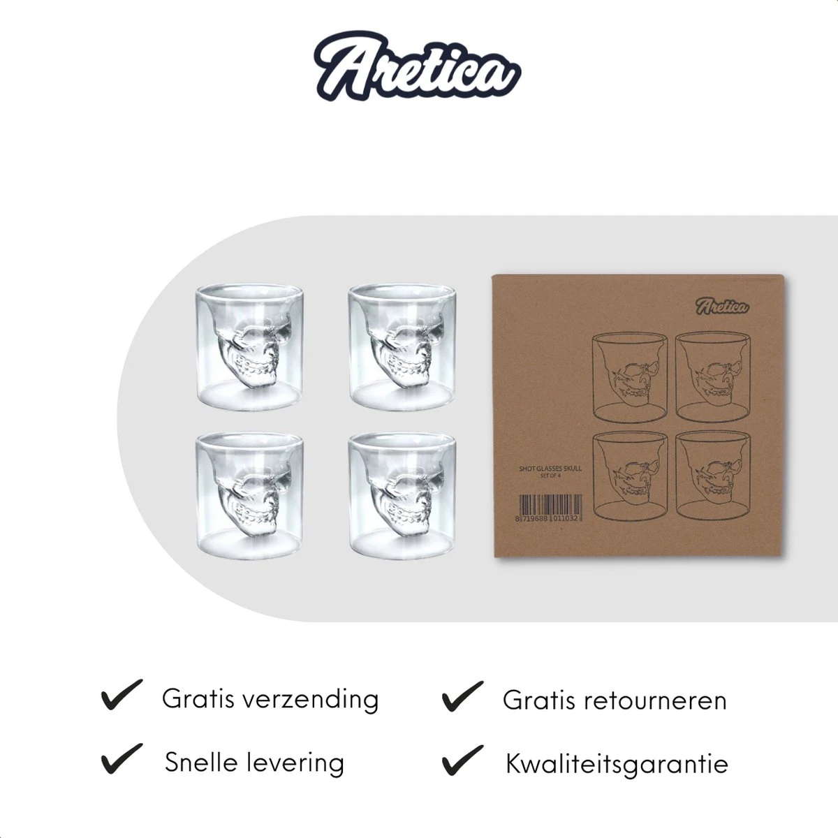 De schedel is gevormd aan de binnenkant van het glas wat een mooi 3D effect geeft. De skull komt voornamelijk tot zijn recht wanneer deze met een donkere drank wordt gevuld. Met deze Aretica skull glazenset zet je in ieder geval iets aparts op tafel. Hoewel de schedel klein lijkt, heeft elk shotglaasje een inhoud van 25 ml.