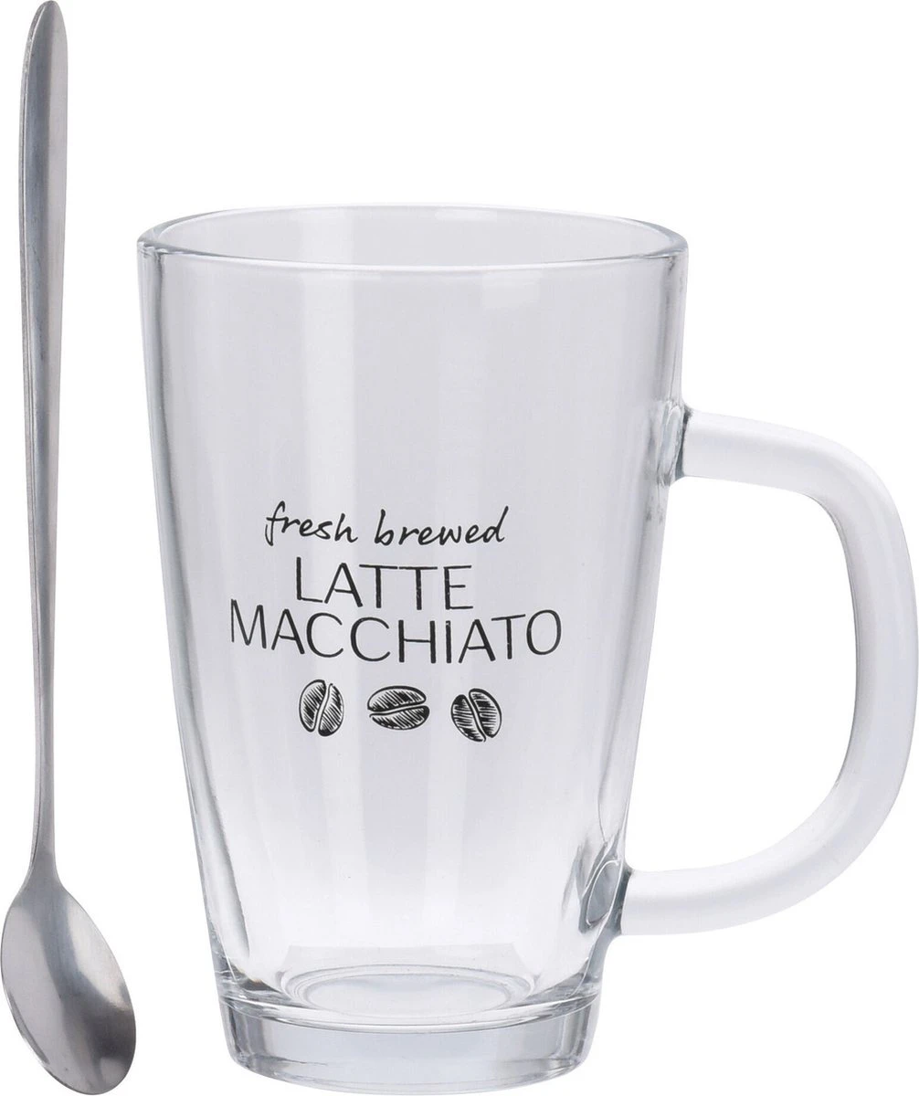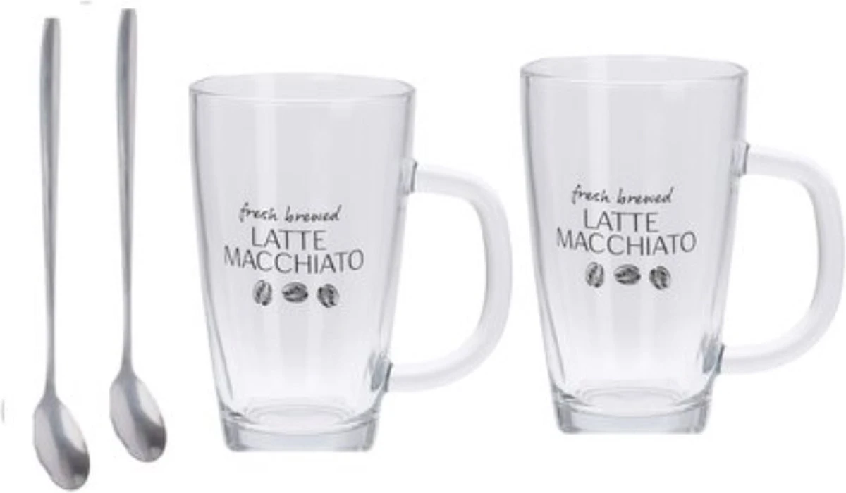 Set van 2x latte Macchiato glazen inclusief lepels 300 ml. Deze Latte Macchiato glazen set bevat 2x glazen met oortje en 2x lepels. De glazen bevatten een opdruk van koffie bonen en de tekst: Fresh brewed latte macchiato. In verband met de opdruk kunnen de glazen NIET in de vaatwasser. De inhoud van de glazen is ca. 300 ml. LET OP: NIET vaatwasser bestendig.