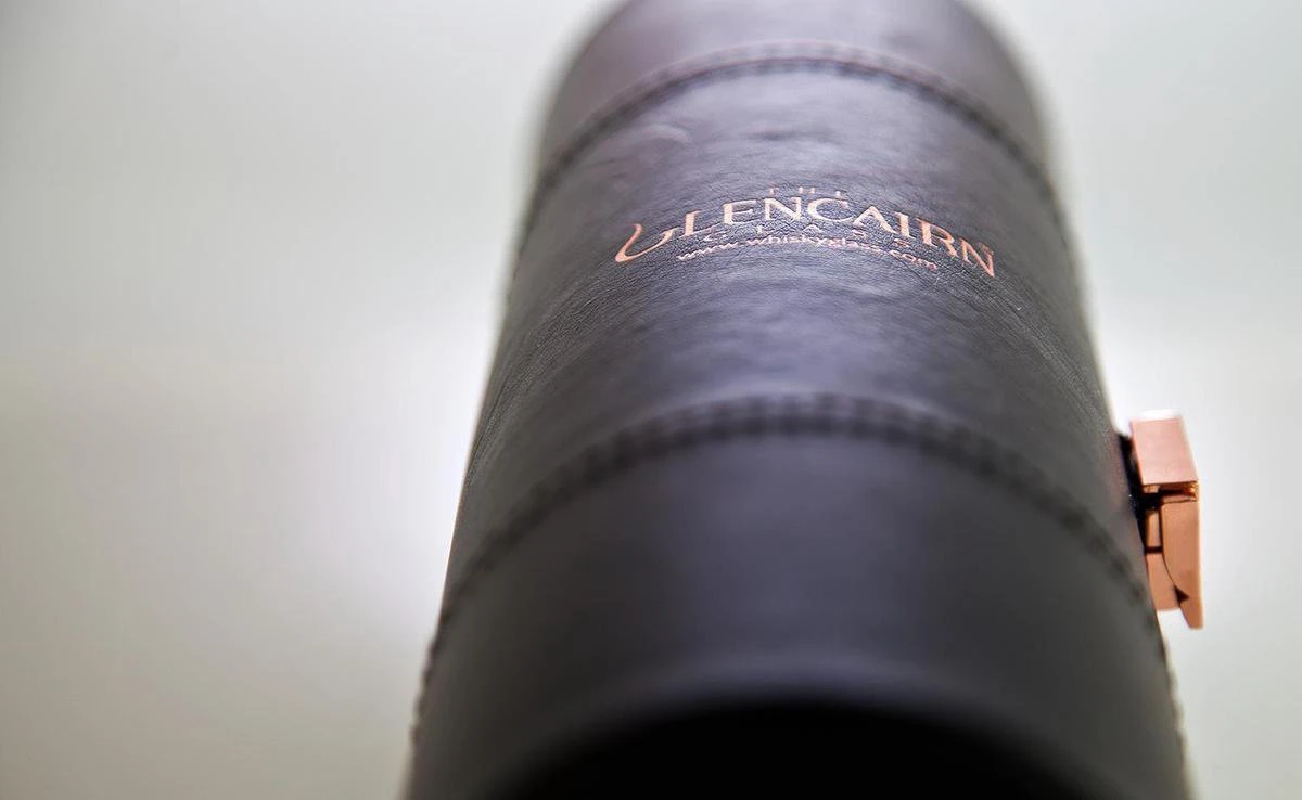 De buitenkant is van mat zwart leer met gestreepte stiksels en voorzien van een bronskleurig Glencairn-logo. De binnenkant is gevoerd in bijpassend suรจde. Sluiting is door middel van een bronskleurige metalen gesp. Er passen perfect 2 Glencairn glazen in.