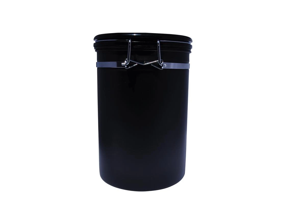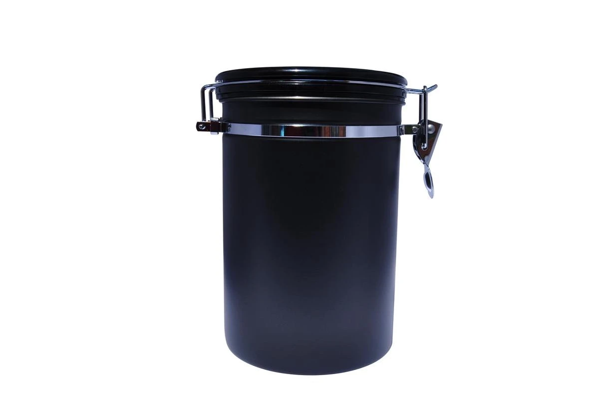 De koffie bewaarbus is te leveren in de kleuren Zilver, Matzwart en Koper ook in kleiner formaat voor 250 gram koffiebonen.