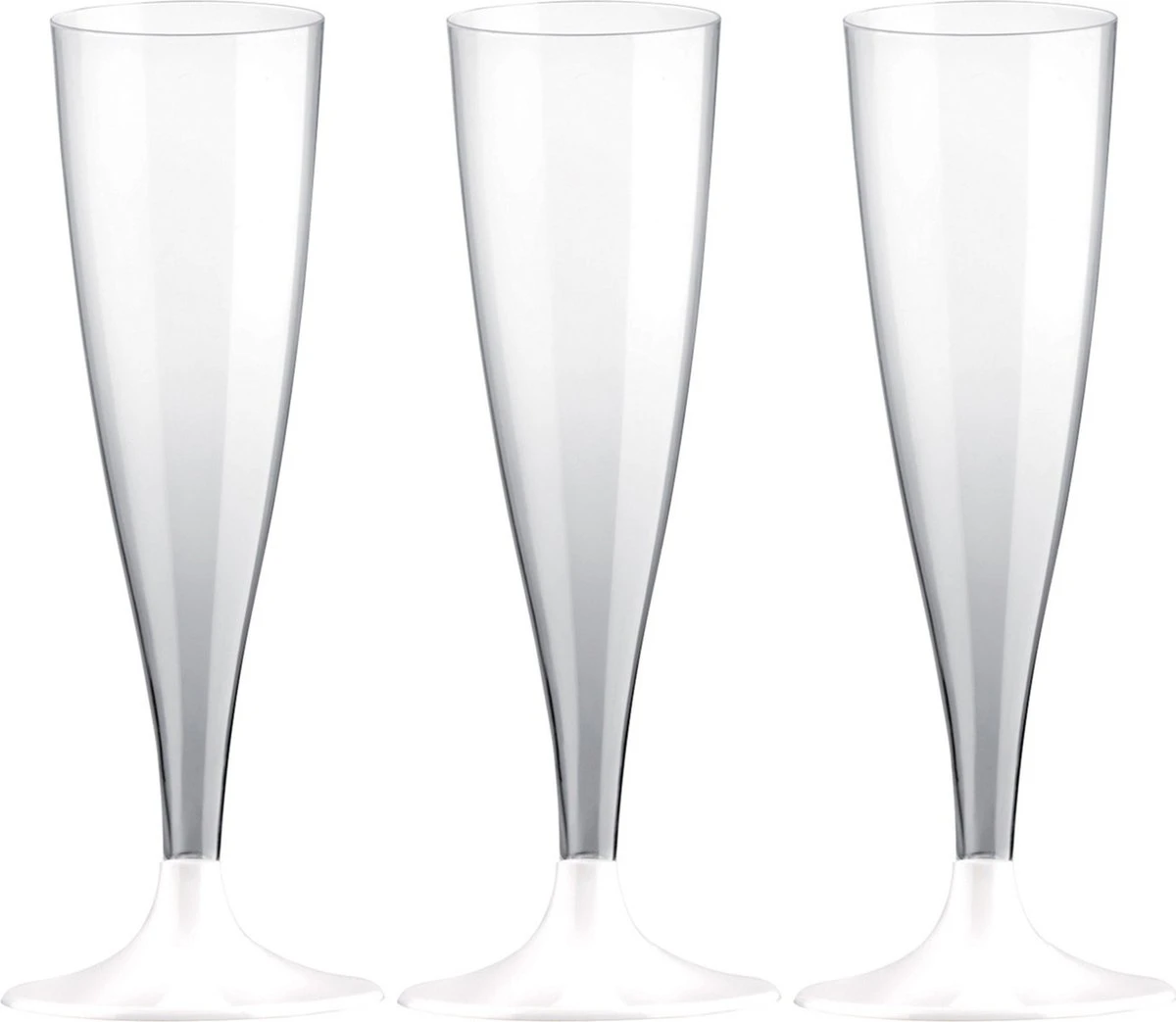 Champagneglazen/flutes kunststof 140 ml met witte voet – set 50x stuks. Transparante glazen met een inhoud van 0,14 liter en een wit voetje. Deze stevige plastic champagneglazen zijn geschikt voor koude dranken. Ideaal voor gebruik tijdens een bruiloft of feestje.Materiaal: polystyrene kunststof. Vaatwasmachinebestendig: Nee, alleen geschikt voor handafwas. Het voetje kan losgemaakt worden. Formaat per glas: diameter 5,3 cm, diameter voet 6,5 cm, totale hoogte 24 cm. Inhoud per glas: 0,14 liter/14 cl/140 ml. Herbruikbare plastic champagne glazen transparant/wit – Stevig herbruikbaar plastic champagneglas.