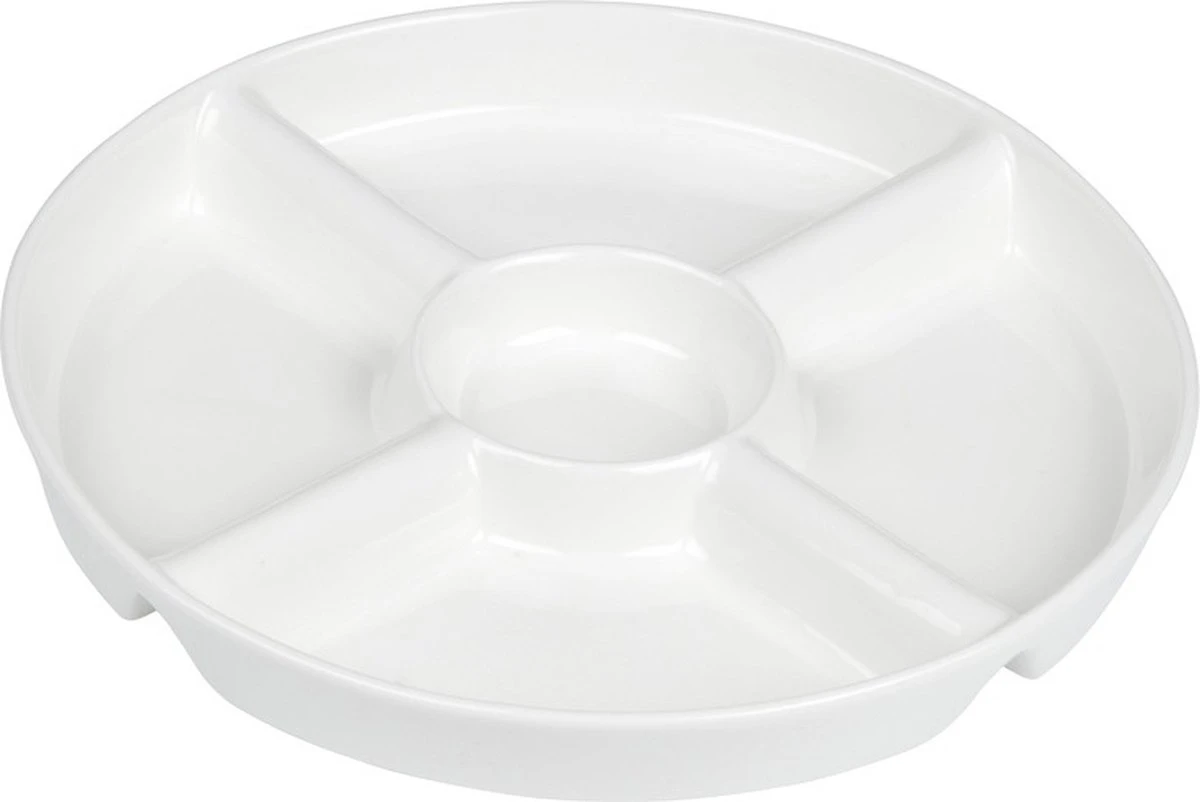 Een witte serveerschaal voor o.a. snacks, borrelhapjes, nootjes en chips, met 5 vakken. Afmeting: ca. D23 x H3 cm. Materiaal: keramiek. Vaatwasser geschikt. Keukenbenodigdheden serveerschalen/snackschalen met vakken.